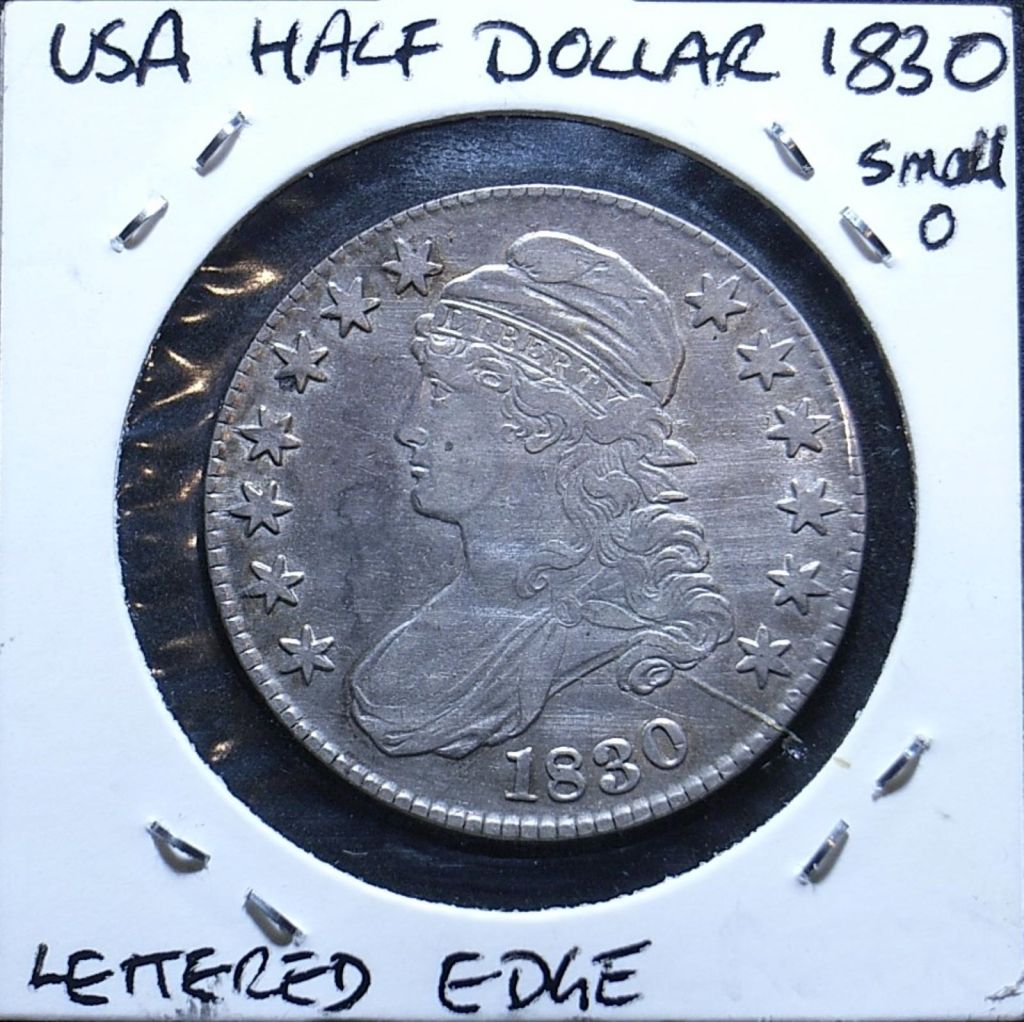 The gory details are: “1830 Half Dollar Capped Bust and Lettered Edge, small “0” in date” in XF40-45 [Clasp and adjacent curl fairly sharp. Brow and hair above distinct. Curls well defined.] Check the photos! (And sincere thanks to the Whitman Red Book for the attribution information.)