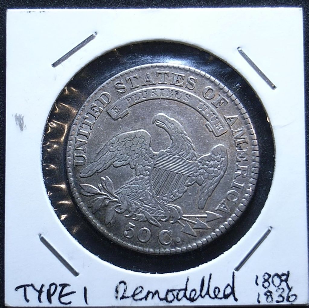 This type of American 50 cents lasted from 1807 to 1836 with what’s known as the ‘First Style’ produced in 1807-8 and the ‘Remodeled Portrait and Eagle’ thereafter. Later, in 1839 when ‘Seated Liberty’ came along, the obverse design stepped away from the ‘revolutionary’ Phrygian cap style of Liberty – I always think of Delacroix’s famous painting (which it turns out was completed in 1830, sans cap…) but in the painting she also holds a musket and is charging…